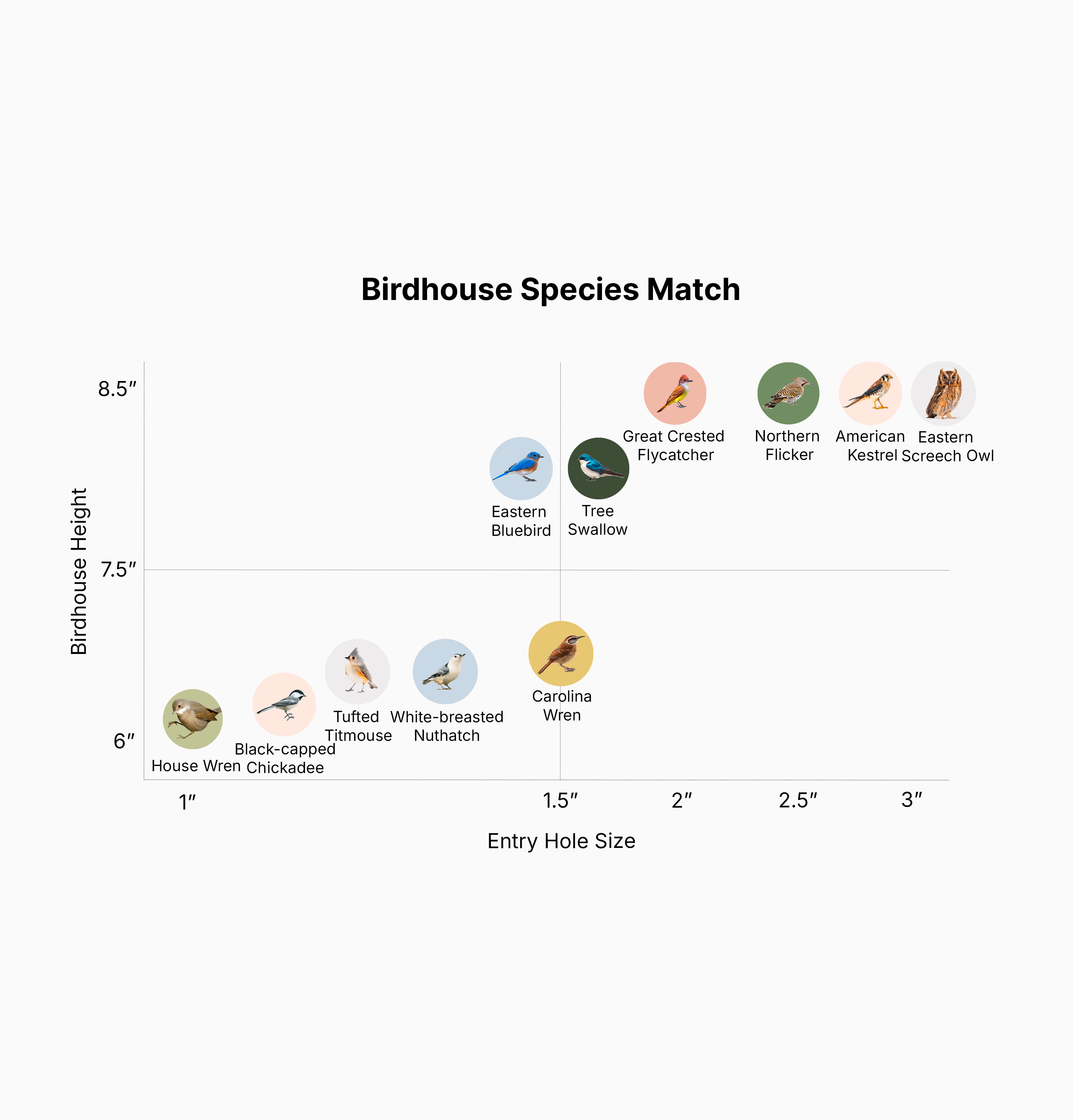 For a complete breakdown of what bird species you can attract with the Beakle Bird House by adjusting the Bird House height and Entry Hole sizes, click here.